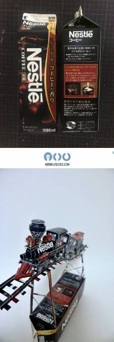 Sekotak kopi ini berhasil disulap menjadi kereta api yang hampir mirip dengan aslinya. Lengkap dengan rel kereta api serta cerobong asapnya, gokss!